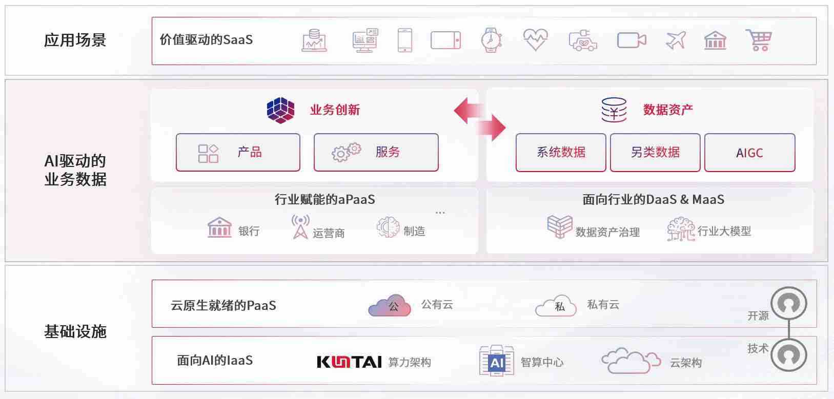 在基础设施层面,,基于商业或开源的云原生就绪开发工具与技术组件(PaaS)和面向AI的底层公共基础设施资源(IaaS),,将共同支撑企业完成数字化转型