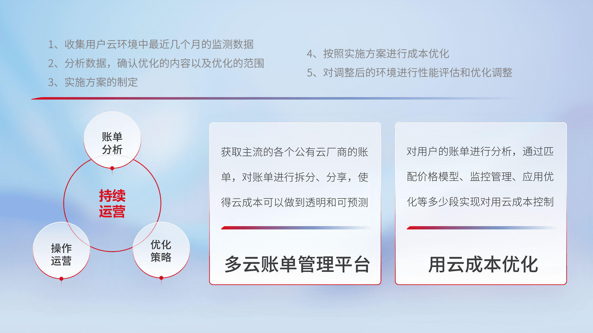 通过多云纳管,,,,以统一的资源数据模型把客户的云资源进行抽象和封装,,,,进而实现对多云资源的统一操作,,保障云资源管理的可靠性、、、稳定性与可用性。。量身定制化运维内容,,,,配置、、、、开发运维、、、、补丁管理、、、、备份、、、、监控、、认证和访问管理、、、、审计和日常巡检等,,,,保障在用云过程中的可靠度,,,稳定度以及高可用率。。。。